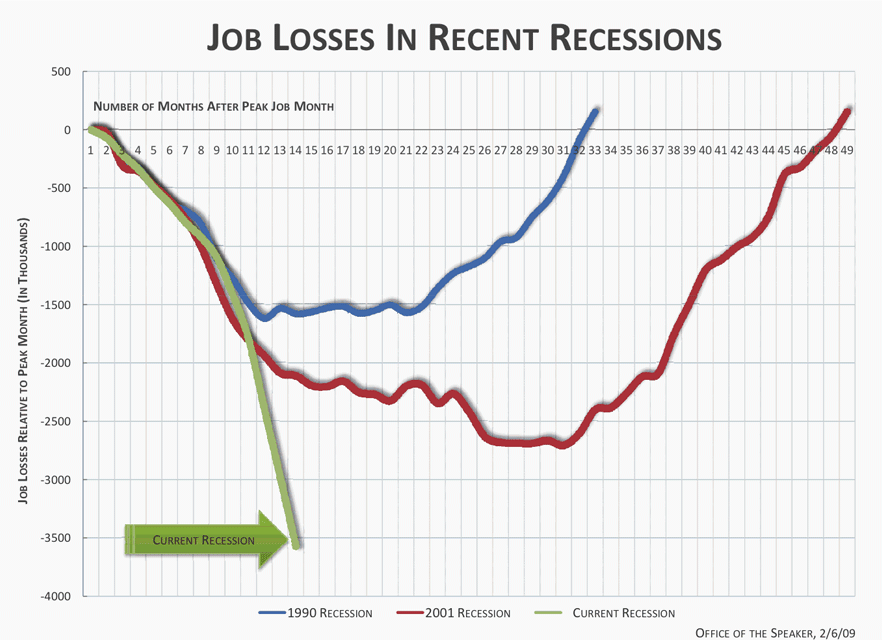 La présidente de la Chambre américaine des Représentants, la démocrate Nancy Pelosi, présente sous forme de graphique comparatif les 2 dernières récessions avec celle que nous traversons actuellement.