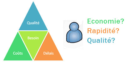 Dans la majorité des projets, cette question est posée, indirectement ou pas, au client. Dans des conditions optimales, la qualité se situe à la rencontre des attentes des utilisateurs, des spécifications et de la réalisation. Cette représentation en triangle est utilisée dans beaucoup de secteurs d’activité : le client a le choix de 2 options parmi les 3 suivantes : la qualité, la rapidité d’exécution ou un prix avantageux.