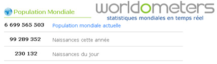 Worldometers.info — un site qui donne en temps réel des statistiques mondiales sur la population, la politique, l'éducation, l'environnement, l'énergie et la santé.